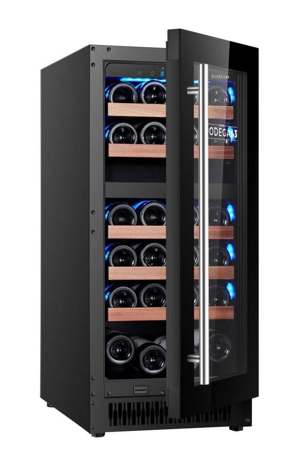 Deze kleine BODEGA43 wijnkoelkast is eigenlijk een wijnklimaatkast. Hij kan namelijk niet alleen koelen, maar ook verwarmen. Dat zorgt voor een nòg constantere temperatuur. De bovenste zone biedt plaats aan 10 flessen wijn die je kunt bewaren tussen 5-12 graden. De onderste zone kan je instellen van 10-20 graden en biedt plaats aan 18 flessen. De luchtcirculatie van de B4328 verloopt via een koolstoffilter, waardoor ongewenste geuren in de wijnkoelkast meteen worden weggenomen. De zwarte volglazen designdeur heeft isolerend driedubbel bruin-grijs glas en is voorzien van een dubbel uv-filter zodat invallend licht niet schadelijk is voor je wijnen.