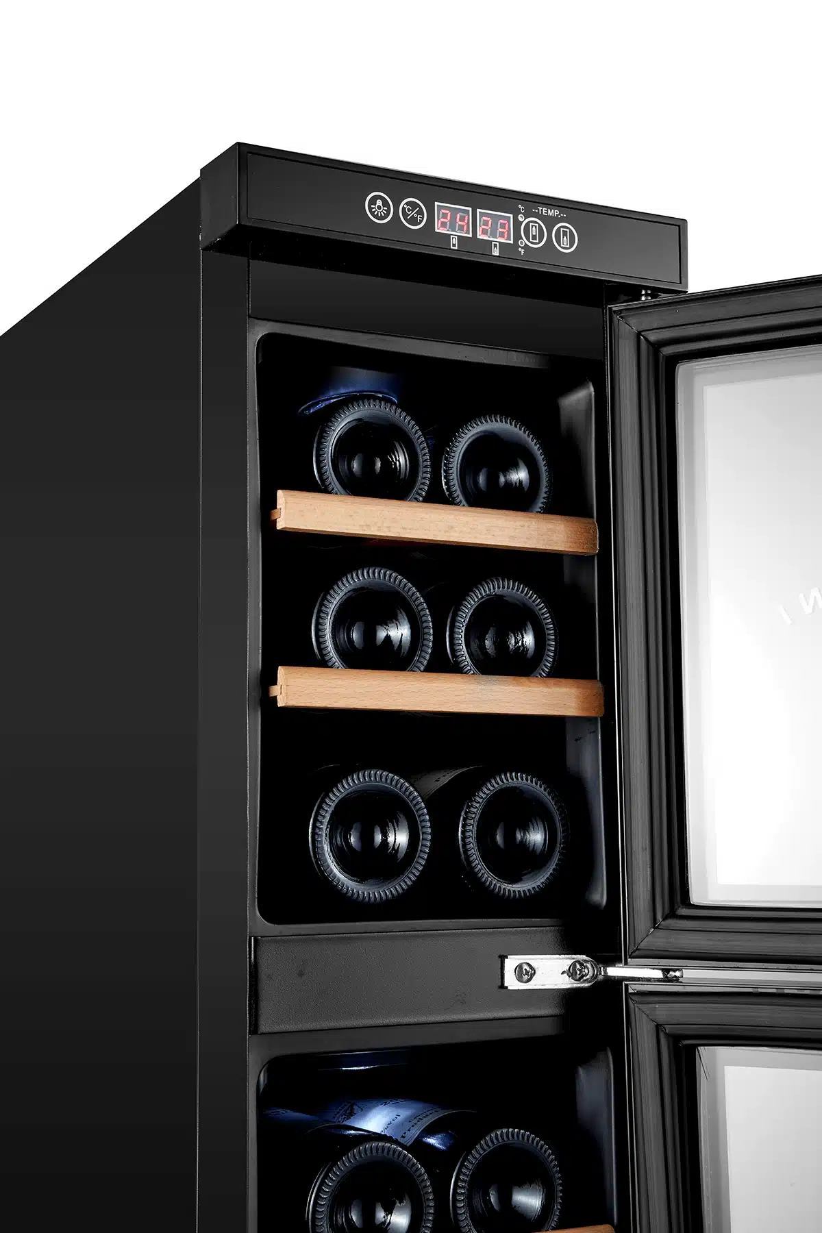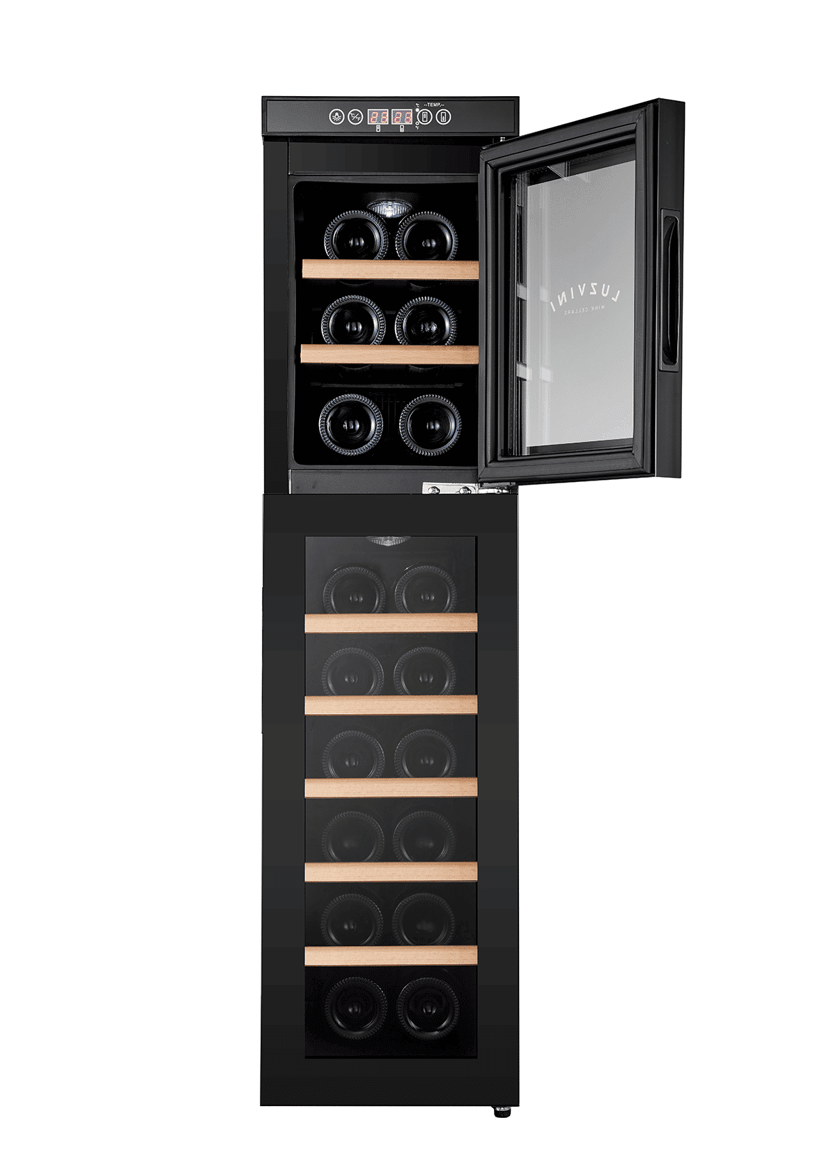 De smalle LuzVini LV18 wijnkoelkast met 2 afzonderlijke deuren voor de 2 temperatuurzones is een unieke variant in de wijnkoelkast wereld. Je kunt 6 witte wijnen op 8°C tot 12°C graden bewaren en 12 rode wijnflessen op 12°C tot 18°C graden bewaren. Door de afzonderlijke deuren hoef je niet onnodig de temperatuur op te laten lopen. De stijlvolle beukenhouten plateaus zorgen voor een luxe indruk bij je gasten. Het dubbele- en UV werende glas zorgt ervoor dat de wijnen beschermd zijn tegen zonlicht. De temperatuur van de LuzVini LV18 kan via het soft touch bedieningspaneel aan de buitenzijde worden ingesteld. De temperatuur wordt op de twee LED displays aan de voorzijde van de smalle wijnkoelkast getoond.